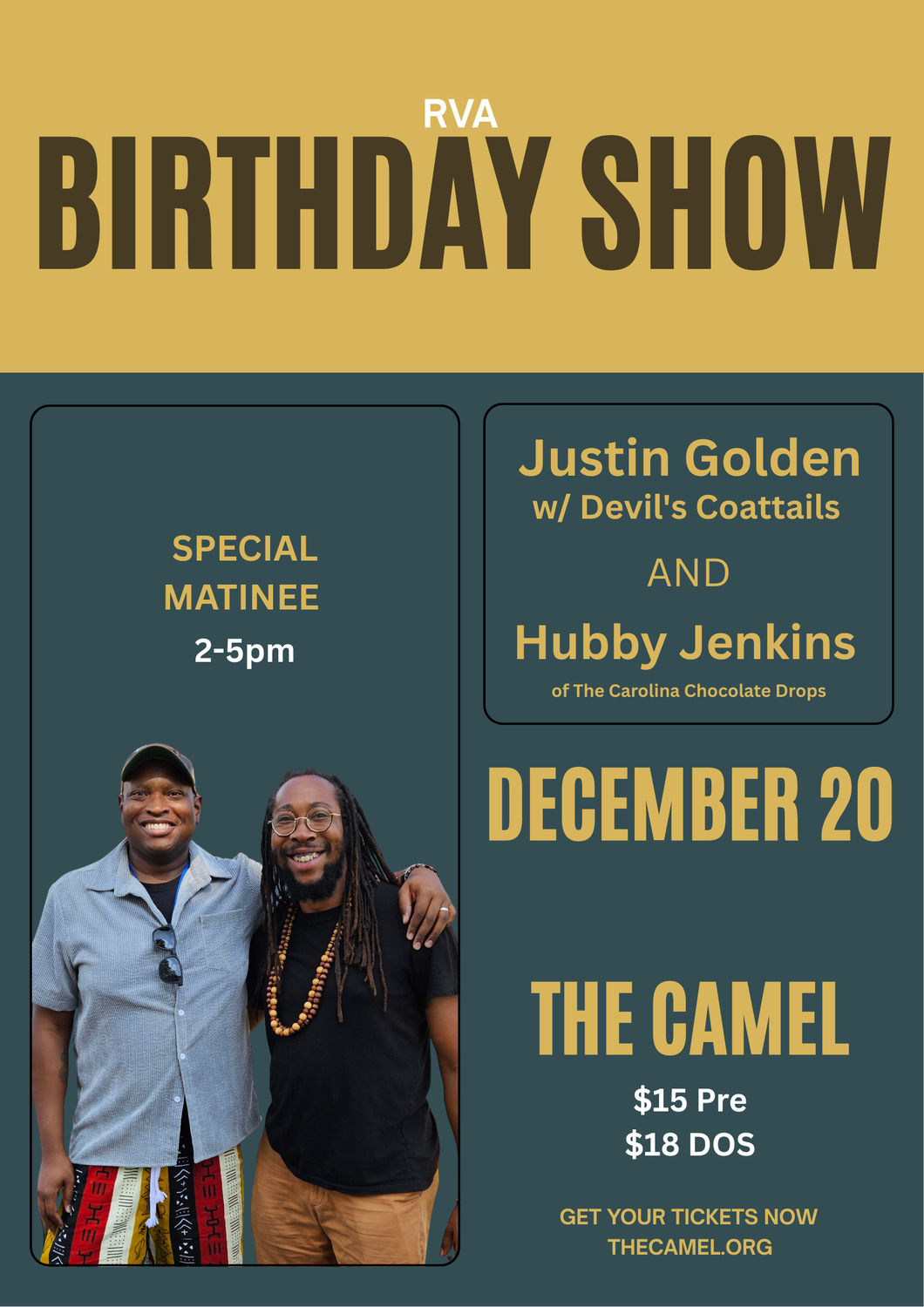 Justin Golden w/ The Devil's Coattails & Hubby Jenkins (of The Carolina Chocolate Drops) Matinee Saturday, December 20th, 2025 at The Camel Doors: 2PM Show: 2:30PM